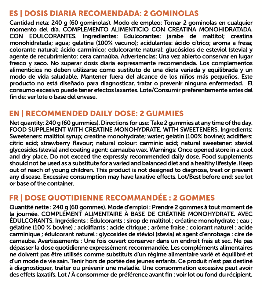 - Creatina Monohidrato en formato gominola: cada dosis aporta 3g de creatina.