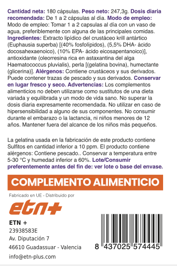 ADVERTENCIAS: No superar la dosis diaria recomendada. Mantener fuera del alcance de los niños. No utilizar en caso de alergia al pescado, crustáceos o cualquiera de sus componentes. No consumir durante el embarazo o la lactancia, ni en niños menores de 12 años. Conservar en lugar fresco y seco (5–30 °C) y alejado de la luz.