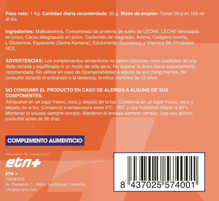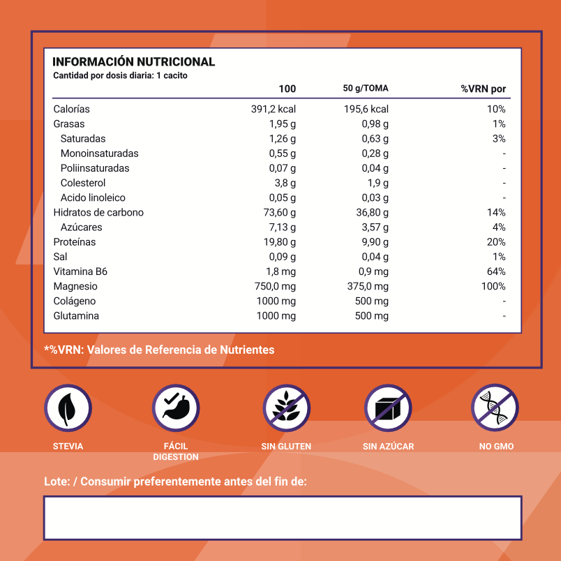 MODO DE EMPLEO: Mezclar 1 cacito (aproximadamente 50 g) con 300 ml de agua o leche desnatada. Consumir dentro de los 30 minutos posteriores al entrenamiento.
