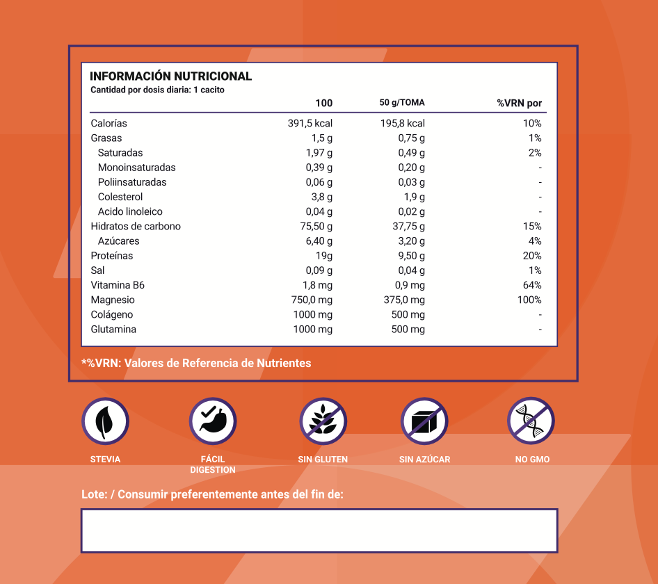 -9,50g de proteína por porción: Favorece la síntesis proteica y el crecimiento muscular.